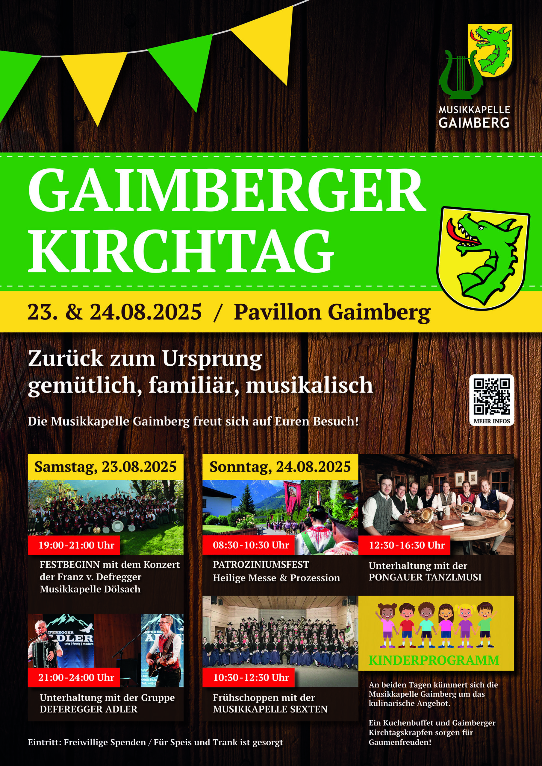 Am 23. & 24. August 2025 dürfen wir heuer als Musikkapelle Gaimberg den traditionellen Gaimberger Kirchtag austragen.